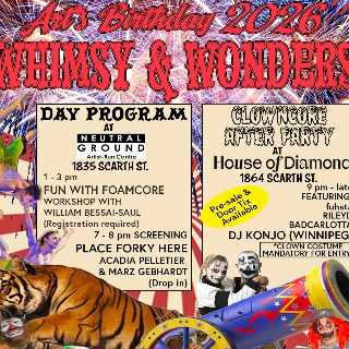 Art’s Birthday Whismy and Wonder| January 24th Fun with Foamcore | Workshop Instructed by William Bessai-Saul | 1-3PM | Limited Spot Available | Neutral Ground .. Place Forky Here | Screening | Acadia Pelletier and Marz Gebhardt | 7-8PM | Drop In | Neutral Ground .. ClOWNCORE After Party | Featuring fuhsta, RILEYD, DJBADCARLOTTA, DJ Konjo (Winnipeg)| 9pm – Late | Pre-Sale and Door Tickets | House of Diamond